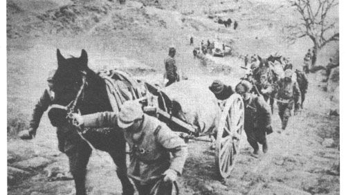 在太行山中的日军辎重队——大行李队,可以看到每车约四人控制前进。