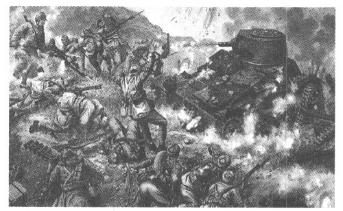 这是一张30年前日本历史图书的插页,题名叫做《袖珍战车的拼死之斗》。日本画家显然想表现日军战车的“神勇无畏”,然而,不自觉中,却留下了那个时代中国军人用血肉筑成长城,宁死不屈的战魂。