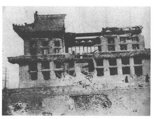 长城抗战中激战损毁的山海关城楼。这一战,东北军何柱国部奋起抵抗,开东北军撤入关内后抵抗的先河。此战,安志馨营长殉国。日本人可以摧毁山海关的城楼,但是摧毁古城的炮弹引发的是更强烈的抵抗的怒火。