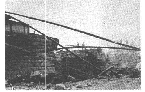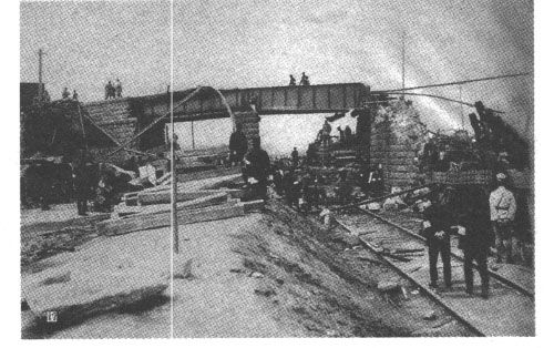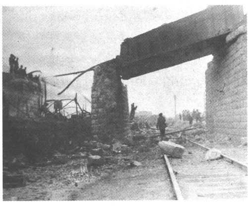 图十二为上层路桥被炸坏的钢轨垂挂下来,可见爆破之严重。
