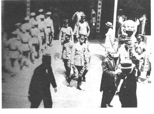 图十九中参加葬礼的日军军官从礼堂走出,左边,一队东北军军官正走进灵堂。日军军官阴翳的面孔,似乎让人想起了一句古诗——山雨欲来风满楼。