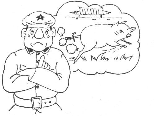 嘴上答应着,这桥本心里一个劲儿地犯嘀咕。原来他生在城里,长在城里,从来也没有摸过猪,更别说逮了!没办法,军令如山,桥本咬着牙跳进了猪圈,接下来就是一场搏斗,出了一身大汗终于用绳子把猪脖子捆上了——看到这儿笔者颇为奇怪,那猪有脖子吗?这个捆法,显然是够外行的啊。