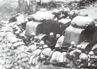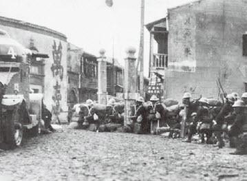 日军进攻中国军队的街垒(29日),左侧可见掩护的M-25装甲车。