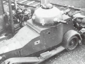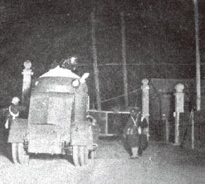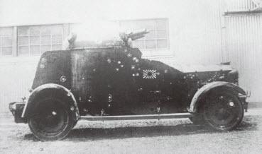 因为侧门上的中弹声音稍少。旗手稍稍推开侧门,随后报告击中装甲车的弹片正在崩飞杀伤周围的日本兵。他边从那里向外望,边喊道:“前方二十米,有三挺敌人的机枪!”一语未毕即被一弹命中,随着一声“我中弹了”掉落车外。