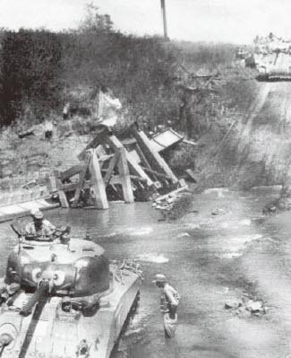 日军炸毁河上的桥梁试图阻挡追兵,中国坦克兵驾驶战车徒涉溪河继续追击。