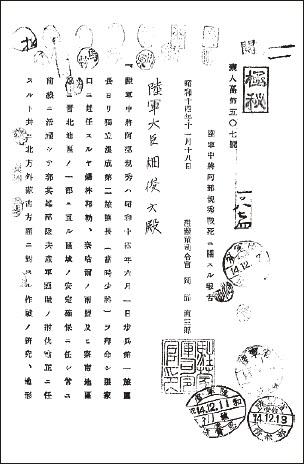 报告首页,注意上面大量的戳记,说明日军高级将领中曾有多人调看过该材料,也可以间接感受到日军对阿部规秀战死所感到的震惊。