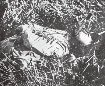 在庐山攻坚战中,被击伤的日本记者右为同一场战斗中日军一名军官拖曳被击伤的同伴逃离战线。
