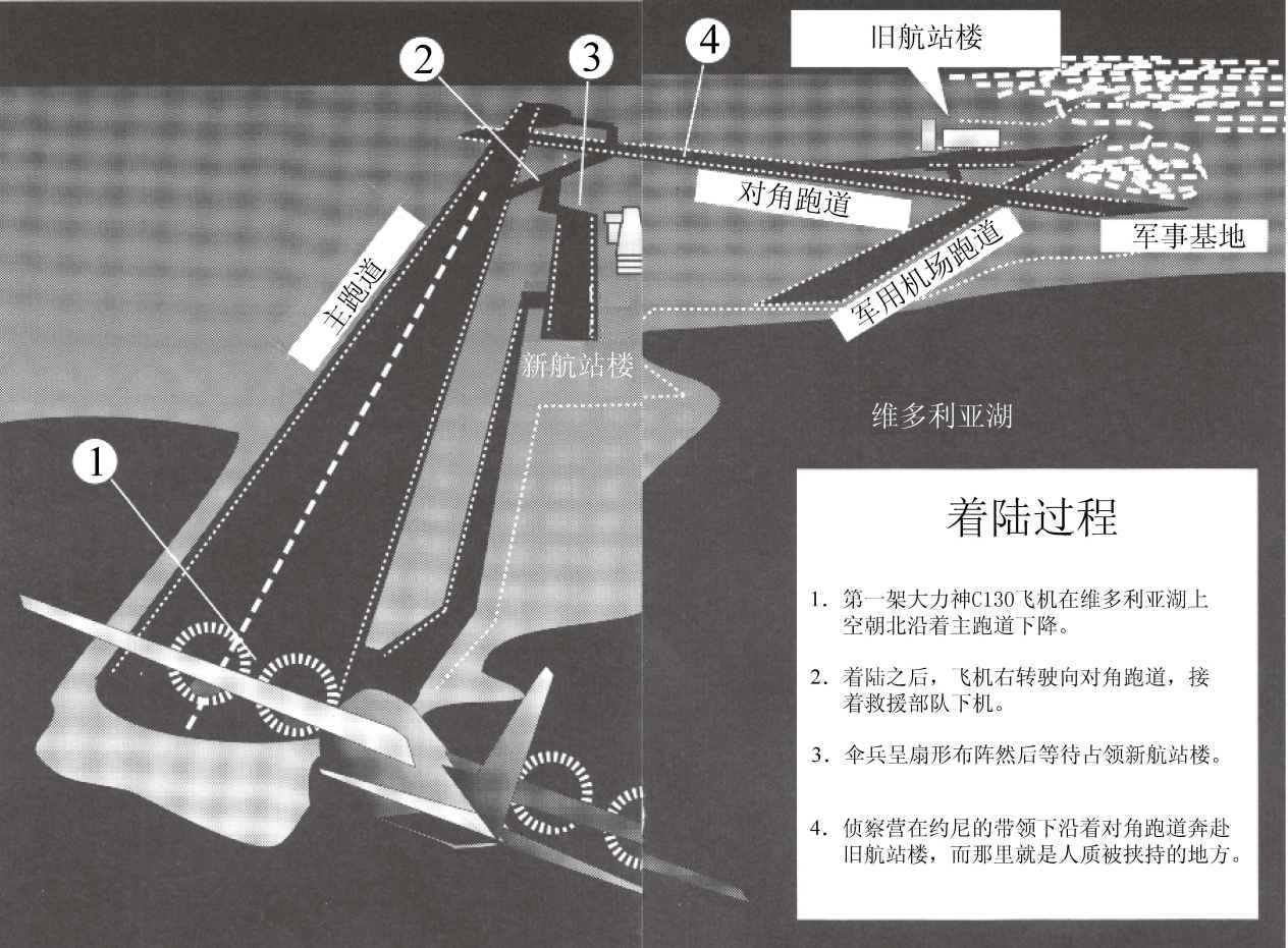 约尼和肖姆龙、维尔奈一起,在驾驶舱监视着机场前方。在跑道的右边,是灯火通明的新航站楼。稍远处的东边,是看不太清的旧航站楼,但是灯光全都开着。约尼迅速走到队伍中间,穿上弹药背心,然后爬上奔驰车的前排座位。在他前面,就是机舱的后门。在他右边的汽车窗户旁边,站着刚从驾驶舱跟来的马坦·维尔奈,他已经在侧门附近就位。伞兵突击队将从这道侧门出发,在跑道上放置备用指示灯。