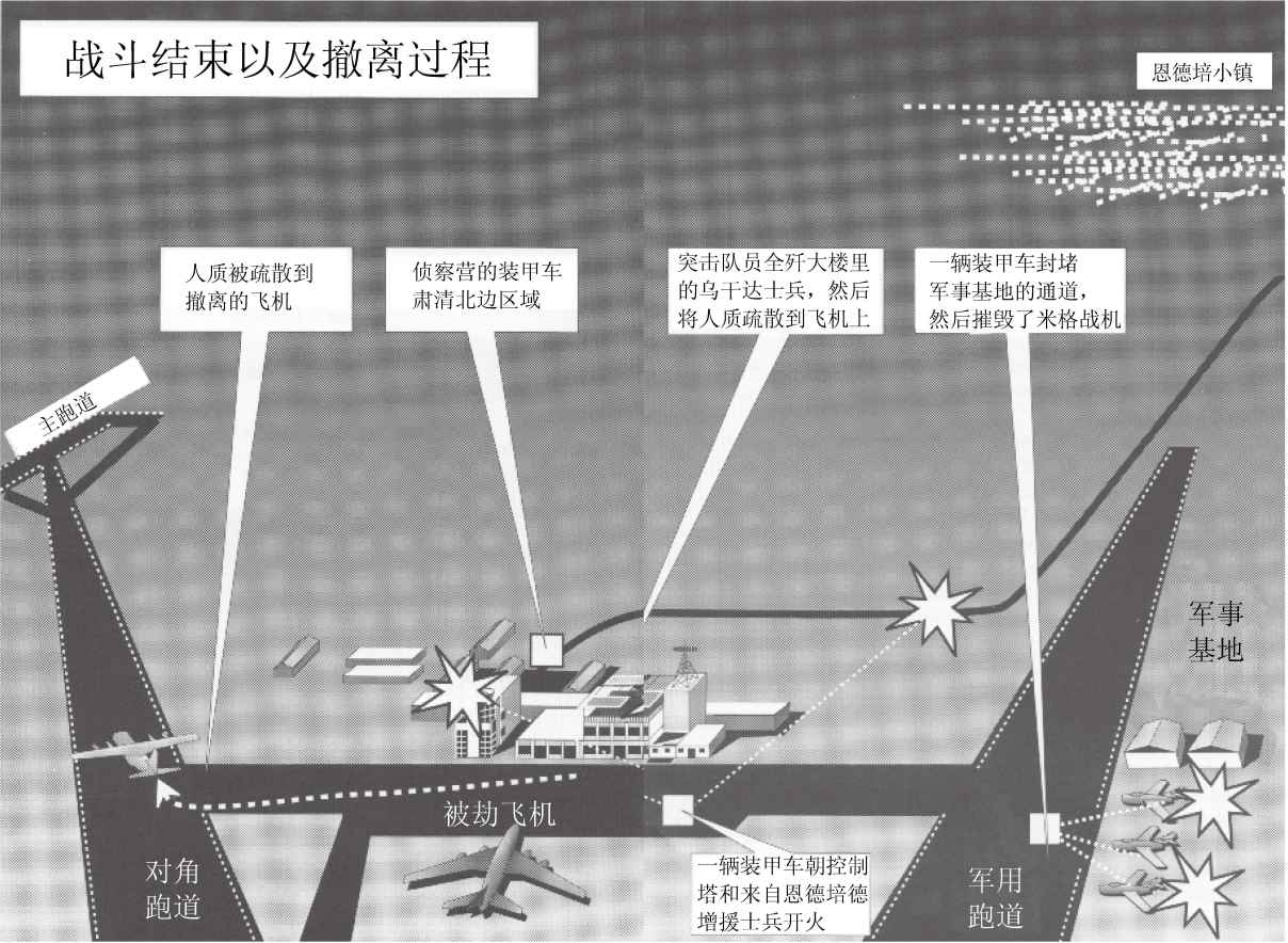 突然,两名乌干达哨兵出现在那条进路上,站在奔驰车前灯的亮光处。一个靠左,一个靠右。布克瑞斯的脑海里闪过一个画面,那是前一天晚上的模拟训练,约尼就在同样的位置安排了两名“哨兵”。这个时候,他意识到:行动将会一举成功。