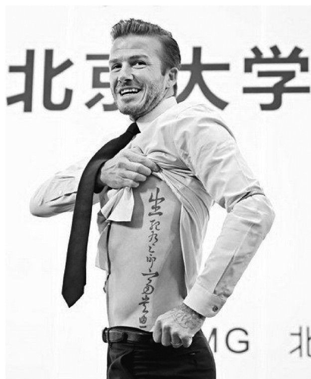 2013年3月24日,贝克汉姆北京大学见面会上,露肋下纹身“生死有命富贵在天”。