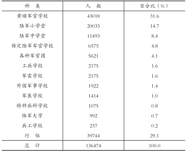 北伐完成后,由于国民政府的努力,军事教育逐渐标准化,中央军校成为初级军官的主要制造场所,学生毕业后通常均分发至国民政府的部队,例如陈诚的第十八军,从连长、排长至师长,有80%为黄埔出身。[47]在德国顾问的协助下,这些军官的素质,一般认为颇高,[48]但是数量过少。据估计,1928年至1937年之间,中央军校毕业学生仅有10 731人。[49]抗战爆发后,中国和其他国家一样,由于对军官的需求剧增,必须加速训练工作,水准自然因而下降。至于自行伍升上来的军官,虽未接受过特别的军官教育,但是在战场上常被指挥官及官兵视为比仅受过速成教育的军官更值得信赖。[50]
