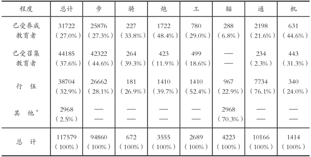 由表1-7的分类方式,可以看出这项统计的主要目的,在于宣扬军训部的业务绩效,不过也透露了中、下级军官的出身背景。所列数字,虽然对于养成教育和召集教育的内容均未作细分,似嫌简略,但是对于各兵科却分别加以统计,极具史料价值。