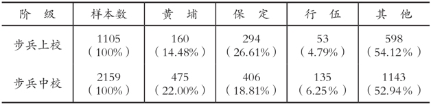 步兵向为国军的主力,占中、下级军官人数80%以上,值得作深入的观察。前引《陆海空军军官佐任官名簿》共收录有步兵上校1 105人、步兵中校2 159人的资料,兹将其出身背景分别统计如下: