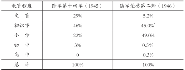 表1-9所举荣誉第二师,系由康复伤兵所组成的部队,其中老兵较多,因此识字者也较多,应是造成文盲比例较十四军为少的原因之一。