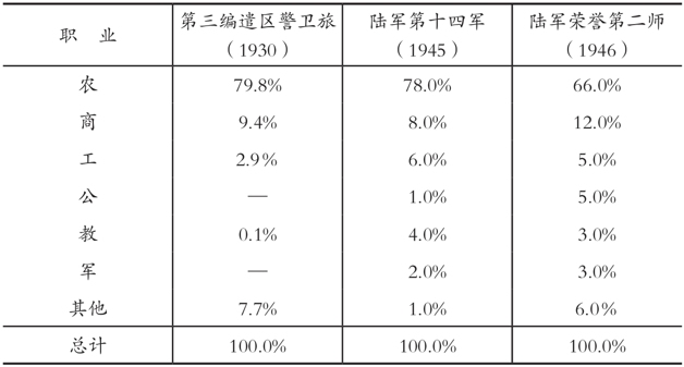 表1-10所列前两种统计数字颇为一致——出身农家者约占80%,与整个社会的农业从业人员比例接近。[76]至于荣誉第二师士兵出身农家者较少,或许是由于原务农的士兵受伤后,离开部队返乡者较多所致。