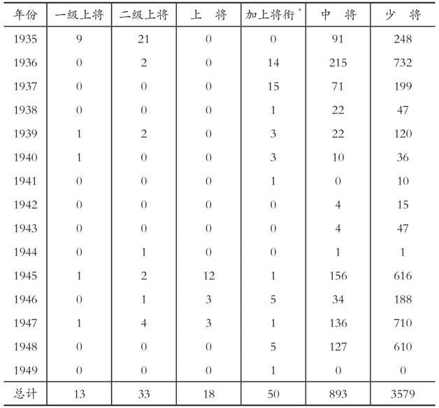 表2-1显示,战前两年国民政府任命将级军官甚多,抗战八年期间任命将级军官较为频繁者,为抗战爆发后的前三年(由于战况较为激烈之故)和1945年(抗战胜利,擢升有功人员),其余各年任命将级军官均少;且大多限于少将阶层,其余各阶层均少,显示抗战期间将级军官的升迁和战前相较,并非易事。[62]