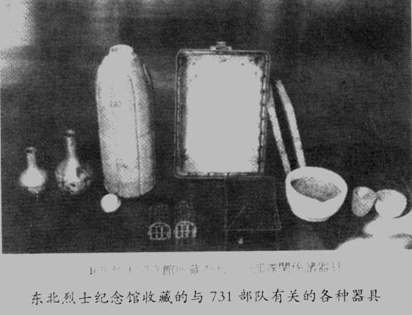 东北烈士纪念馆内731部队遗留的资料,在二层的走廊展出。展柜中展有一枚宇治式陶瓷炸弹,一个硬铝制带盖的箱子(琼脂培养器),大大小小的乳钵,两个叫作“坩埚”的白金制血清瓶以及捕鼠器。