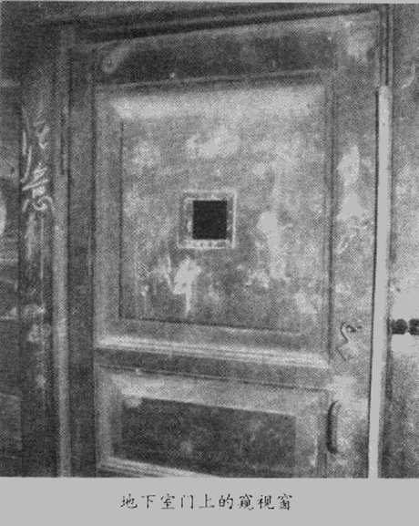 当时在场的人对突然闯进来的我们,投以惊奇的目光。当我们说明来意之后,他们便欣然做了我们的向导。“白桦寮”后面那座二层楼的地下室里,有一米左右宽的走廊,在一边排列着八个像口琴孔一般的房间,门上都带有门闩,里面的确就是地下监狱。向左最里面的房间是“水牢”。装有铁栏杆的大门紧闭着,而且上了锁。现在,其中一间做了休息室,灯光下有两位妇女在休息。