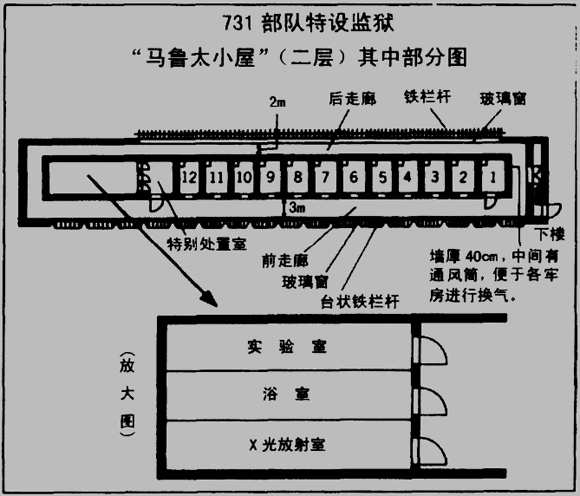 两人走近钢瓶前,举目巡视了一下被口字楼环抱的院子。那里有两栋左右对称的用铁丝网围着的建筑物。这里就是731部队的特设监狱——通称“马鲁太小屋”。