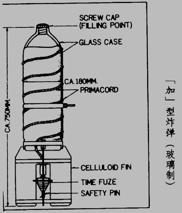 螺旋盖(注入口) 生产:1940年,50枚 玻璃制弹体 重量:35公斤 导爆索 容量:约10升 赛潘珞尾翼 定时信管 信管:定时信管(由炮弹用5型复合信管改造而成) 安全栓 炸药:波导线约3.5米