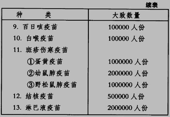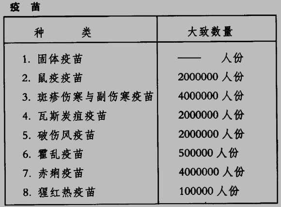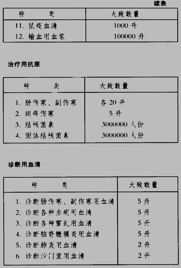 关东军防疫给水部本部根据关东军部队长的命令,对部队、军队的民间雇员,“满洲”及东北、朝鲜关东军管辖下的部分居民储备和提供疫苗和血清,其主要种类与数量如下: