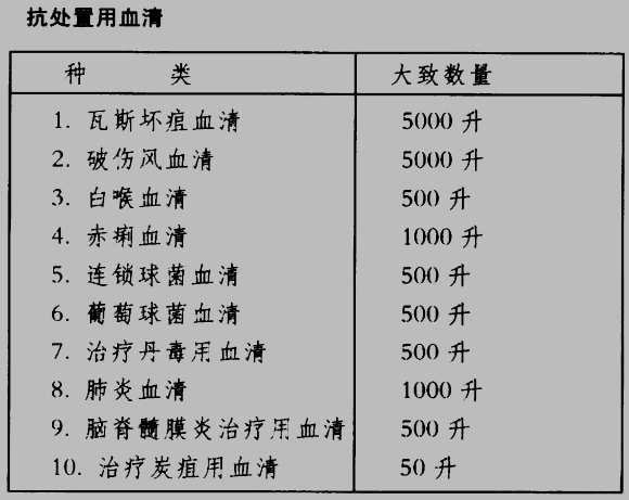 a.瓦斯坏疽血清 b.破伤风血清 c.白喉血清 d.赤痢血清 e.连锁状球菌血清 f.葡萄状球菌血清 g.治疗丹毒用血清 h.治疗肺炎用血清 i.治疗流行性脑脊髓膜炎用血清 j.治疗鼠疫用血清