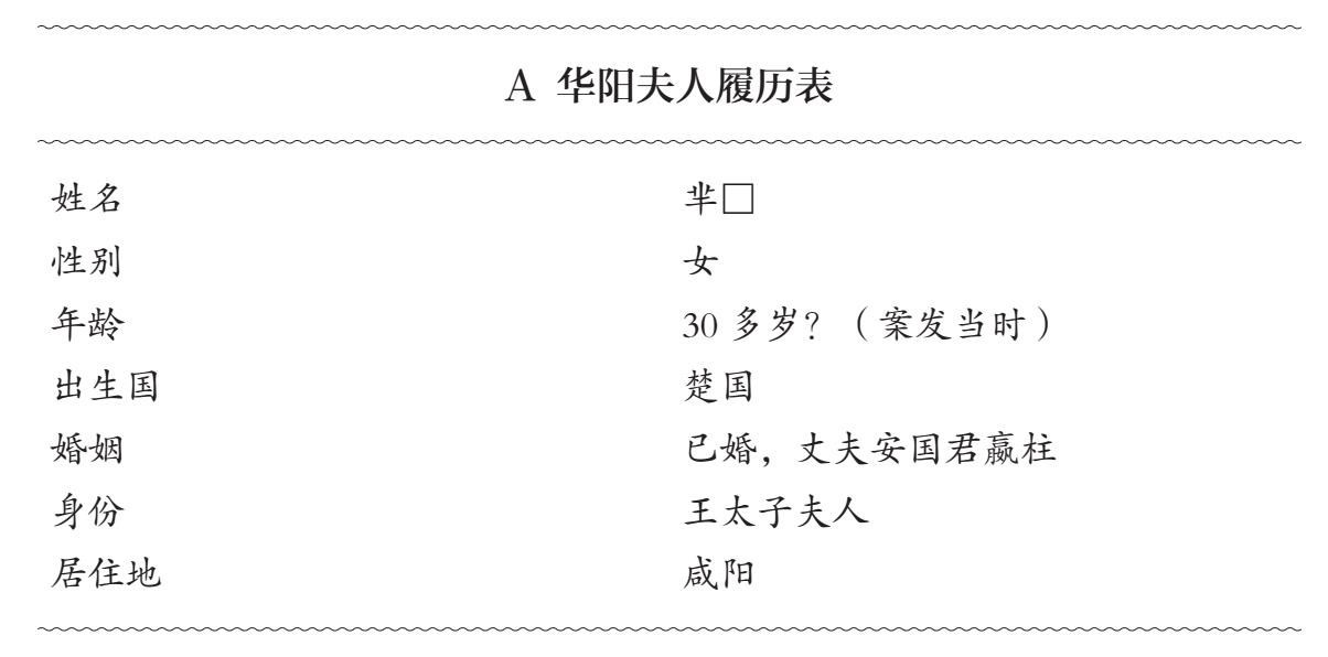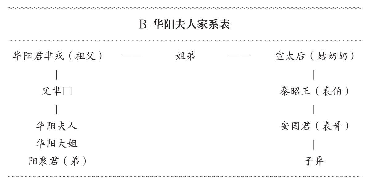 材料A所载华阳夫人的个人情况比较单纯,也比较清楚,除了不知道她的名字而外,似乎没有需要特别说明的地方。材料B所载的情况涉及秦王的家系,两个家族的关系交错在一起,必须做一些说明。