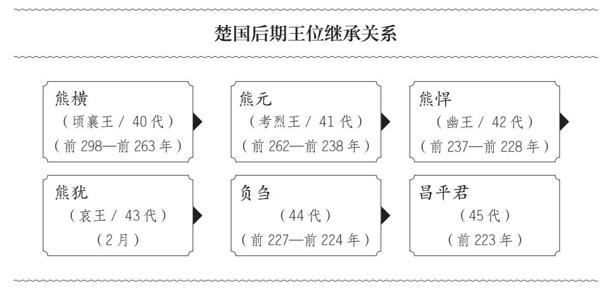 这条材料中的悍,是熊悍的名字。犹,是熊犹的名字,他是熊悍的同母弟。负刍与昌平君,都是熊犹的庶兄。这条史料非常宝贵,是我们现在所知的有关昌平君的父亲兄弟等家世情况的唯一材料。根据这条材料,再结合《史记·楚世家》的记载,我们将考烈王前后的王位继承关系列表如下: