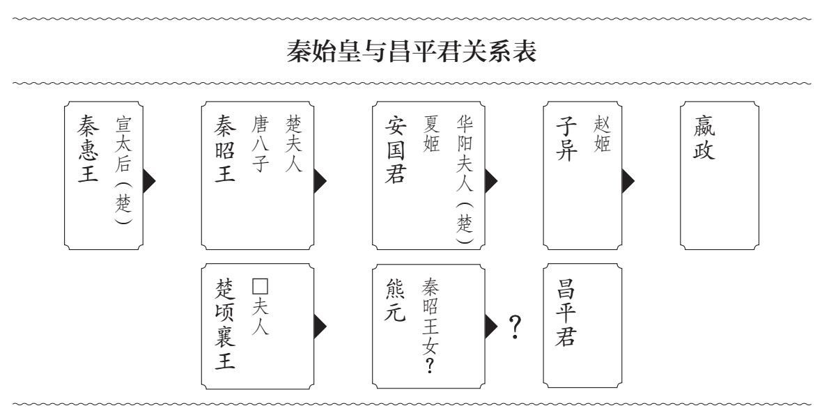 熊元在秦国做人质时,控制秦国政权的是楚国王族出身的宣太后及其楚系外戚集团。秦昭王是宣太后的长子,他有一半楚系的血统,他的正妻也是从楚国迎娶的。以两国间关系而论,当时,楚国是秦国最重要的盟国,又是宣太后的母国,熊元是楚国的王太子,他在秦国娶妻,是有关秦楚两国关系的大事,妻家不但应当同他的地位相当,也应当同秦国王室关系密切。从历史上的情况来看,秦昭王当时大约五十四岁,多子女,熊元在咸阳娶秦昭王之女为妻最符合各方面的利益,也合于古代王室间通婚的礼仪秩序。在没有更为有力的说法的情况下,我们不妨根据这个推测,由母系入手,将昌平君与秦国王室、与秦始皇的关系做一个梳理,结果如下: