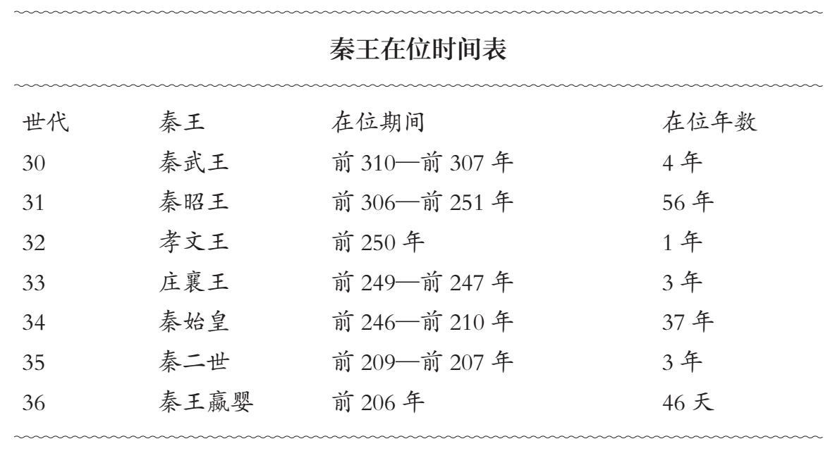 有了这样的结果以后,我们在历史车站买票的时候,就可以考虑买一张从秦王嬴婴到秦武王二年的票了。不过,从秦王嬴婴投降的公元前206年到秦武王二年的公元前309年,一百零三年间共有七代秦王。七代秦王七个站,你买哪一站?还得动脑筋。历史学家又来给你当顾问,他建议你说,不要急,拿张纸拿支笔,先把这七个站排出来,看看有没有什么别的线索。于是,我们列出下面这张表来: