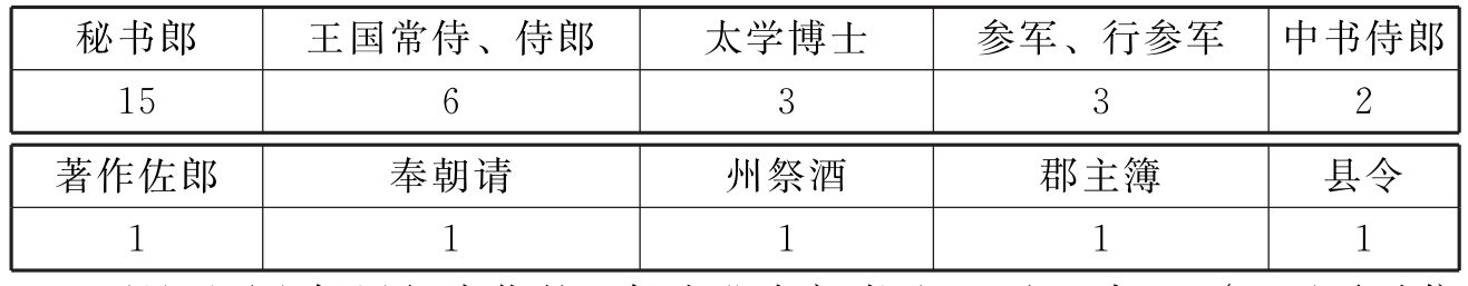 至于国子生之任用,更为优越。南朝之国子生,就我之大略考得者,除去又为西邸学士1人,又应察举者4人之外,其经明经策试后所任之官可知者34人,其任官情况依数量排列如表10—3(见下页):