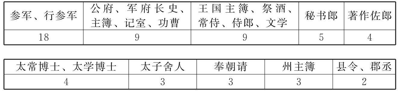 随之而来的一个变化是,察举、学校入仕之途,与面向士族权贵的“清途”,有合一的趋势。魏晋时代之秀才,颇有不能获得乡品二品者,任官一般是八品之中郎、郎中。但南朝秀才无一记为曾拜散郎者。(2)此期秀才任官大略可知者考得63人(应举而授官不就者在内),除3人又为齐竟陵王西邸学士,余60人之任官依数量多少列示如表10—2: