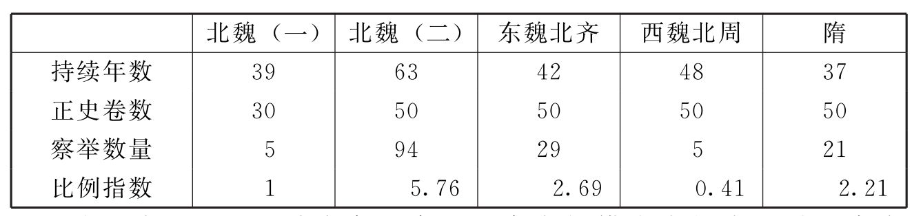 由此表可见,北魏自孝文帝以后察举规模有大幅度上升。事实上,北魏所见之秀孝有相当一部分还就直接举于孝文一朝。这当然是汉化政策的直接成效。但自东西魏分裂之后,察举规模遂趋低落。东魏北齐之察举多少尚能维持,这是因为其疆域虽有缩小,但毕竟处于文化昌盛的山东。西魏北周则下降到了最低点。合东魏北齐与西魏北周计,察举规模也仅仅略过北魏盛时之半。时至隋代,帝国版图已笼括中国,虽其察举规模较北周已有回升,但却仍然有限,不但不能与北魏盛时之秀孝屡出相比,甚至还不如东魏北齐。总之北朝察举自北魏之后即由盛转衰,至隋代虽处于回升之中,但并不迅速。