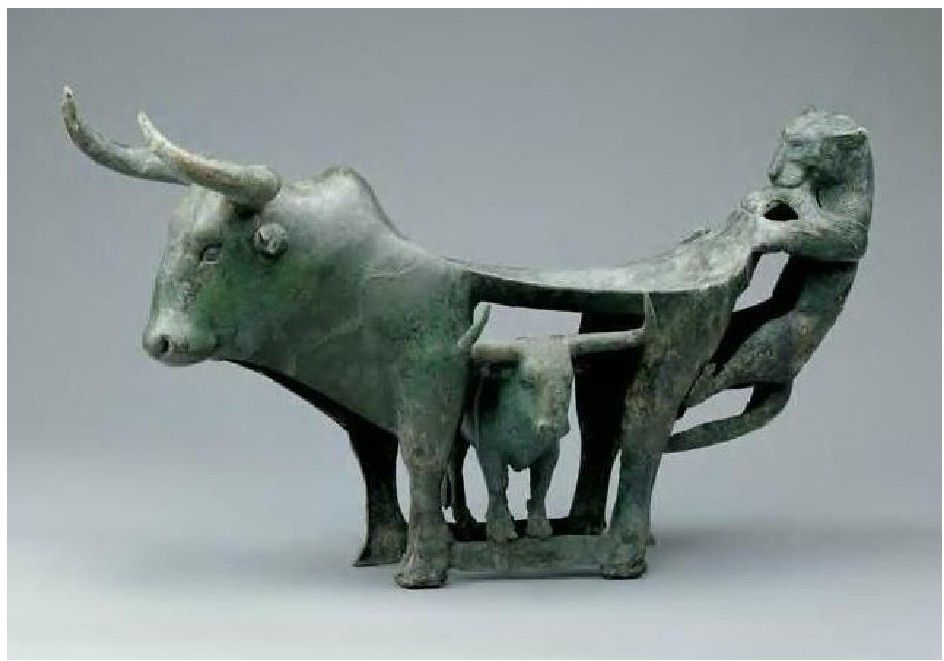牛虎铜案是由青铜材料铸成的案祭礼器。其造型由二牛一虎巧妙组合而成。以一头体壮的大牛为主体,牛四脚为案足,呈反弓的牛背作椭圆形的案盘面,一只猛虎扑于牛尾,四爪紧蹬于牛身上咬住牛尾,虎视眈眈于案盘面。大牛腹下立一条悠然自得的小牛,首尾稍露出大牛腹外,寓意了大牛牺牲自己对小牛犊的保护以及维系种族繁衍的努力。