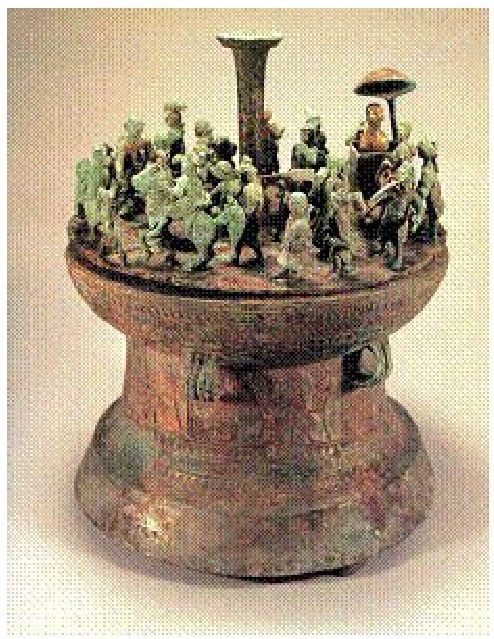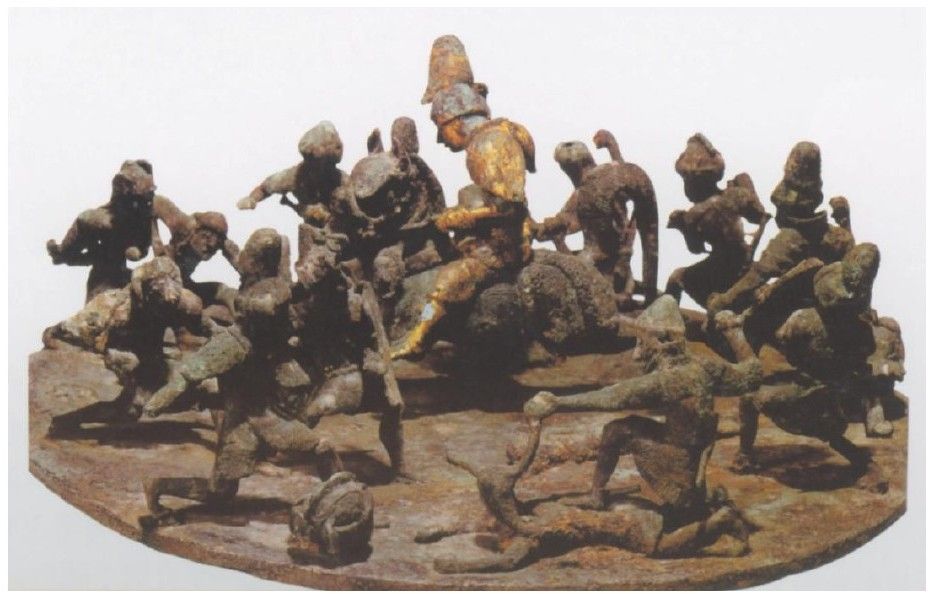 两千多年前,精通青铜制造技术的滇人在富庶的滇池岸边择湖而居,他们的青铜铸造工艺,尽管在操作技术和器材设备上并未发现有何特殊,但浇铸如此庞大的青铜铸件,所需工序之复杂,所费心力之深,可见一斑。在这个既写实又灵活的圆雕战争场面中,我们似乎可以寻到些许两千年前滇人实际生存的痕迹。