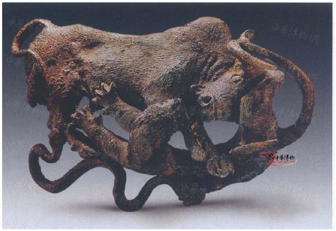 云南青铜器的主要特征,就是崇尚自然、生动,写实、逼真。除此,它还有一个更鲜明的特色:那就是粗犷,崇尚力量。它经常表现人类社会中间的一些杀戮、征伐场面,比如把尸体的头割下来,在手里提着等,这即是某种力量的显现。而表现在动物世界里头,古人也是崇尚同一种丛林规则:弱肉强食。