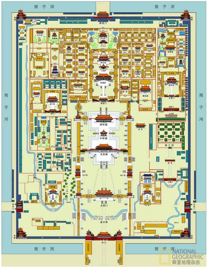晋宏逵:应该是72万平方米。里面的建筑面积大概是14.06万或14.07万平方米的规模。护城河在最外围,宽度有52米宽,城墙东西750多米,南北960多米,是个长方形。城墙四周有四个门,南面正门是午门,东西是东西华门,北侧是神武门,明代叫宣武门,四个角有四个角楼,这样就和护城河一起构成了紫禁城的防御体系,这一块防御体系占总面积的将近三分之一。城墙内部可分为三大块,一是外朝,在中轴线的前半部分,也就是乾门的前面横街向南的部分。它两侧的两个轴线上,东侧轴线上是文华殿,西侧是武英殿,这就构成了外朝的全部。外朝的北侧,这个凹字形的部分,就是它的内庭。