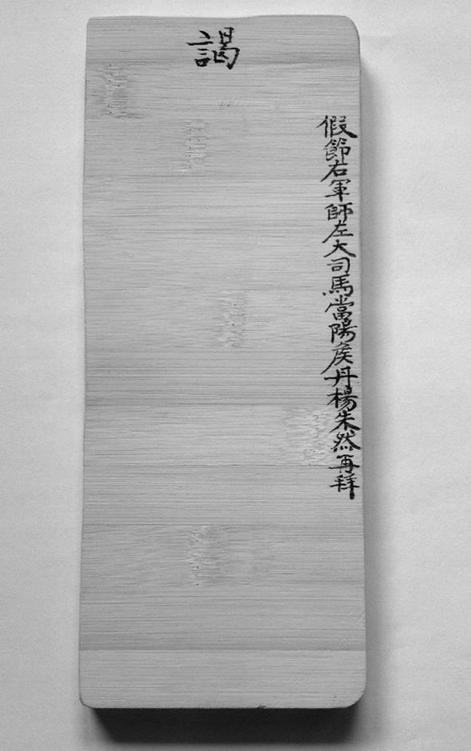 据《三国志》等史书记载,朱然临终前,担任的职务正是右军师、左大司马,被封为当阳侯,与此处的措辞完全吻合。开头的“假”字,出土时完全腐蚀缺损,但是《三国志》卷五十六《朱然传》记载,孙权曾经“假然节”,即给予朱然一柄节旄。所谓“假节”,是当时军事上一种专门名号。“假”的意思是给予,“节”是用竹竿与牦牛尾做成,作为君主所赐威权的凭证。享有这一名号者,有权诛杀违反军法的普通将士。据《三国志》记载,陆逊、陆抗父子,都曾拥有“假节”的名号。比照陆氏父子,这版谒上缺损的第一个字,可以肯定是“假”字。