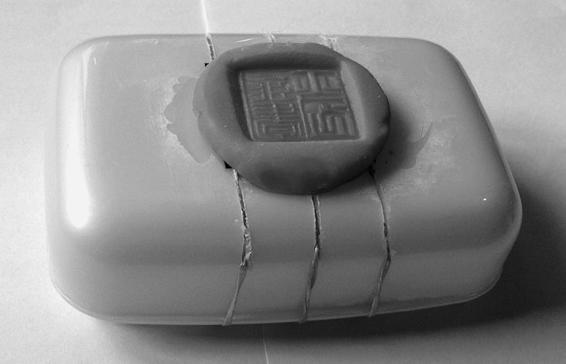 考虑到朱然的军队主帅身份,这应当是当时军事机密文件的传送盒,也就是三国版的密码箱。使用程序应当是五步:①使用丝绢或纸张书写机密文件,折叠之后放进漆盒,再盖上盒盖;②在铁片的位置,用细绳横向依次紧紧缠绕盒身,形成一排细绳的平面。③与三条细缝对应位置的细绳,要借助类似于针的工具,横向穿过细缝,从而使得整个绳圈完全固定,绝不会从盒身上滑脱出去。④将细绳打上死结,剪去多余部分,再用黏性很强的封泥,平铺在铁片上,压紧压平后,加盖印章进行密封。⑤等封泥干硬之后,即可派专人送出。如果途中有人想要偷看盒子里面的机密文件,必须破坏封泥或者细绳,一旦破坏就不可复原,所以必定会被发现。因此,三国版密码箱的构造虽然很简单,设计却极为巧妙,保密功能堪称一流。图3是笔者亲手制作的示意模型,读者诸君可以参看。