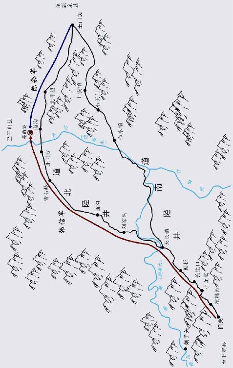 绵蔓水自南而北流经井陉口外[20],赵军大营在水东。汉军出井陉口的动向,赵军已经察觉。不过,正如韩信所意料的,赵军并未在汉军前军出井陉口时开营攻击,而是静观放行,等待韩信大将旗鼓出井陉口后一举全歼。汉军前军抵达绵蔓水后,并未在水西筑营布阵,而是匆匆渡过绵蔓水,在绵蔓水东岸背水向赵军营垒摆开了会战的阵势。陈馀带领部下将领一直在营垒壁上严密监视汉军的动向,当他们看到汉军前军竟然犯下兵家大忌,摆下背水之阵而自断退路时,都忍不住哈哈大笑起来[21]。陈馀益发轻视韩信,坚定了务必等待一举全歼韩信军的信念。
