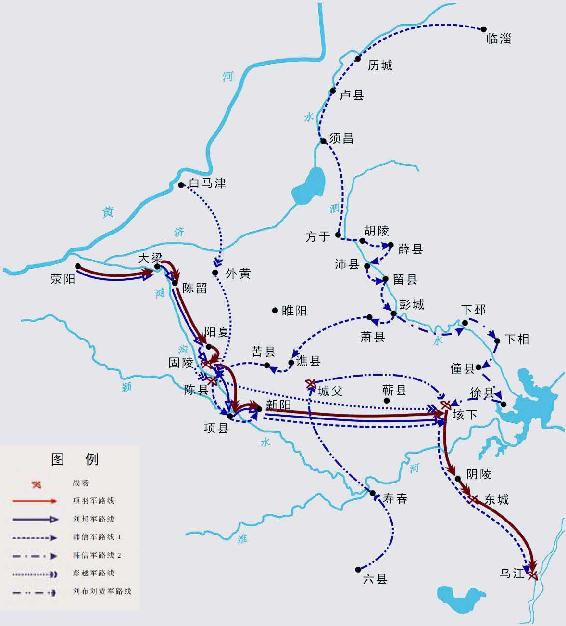 在得到九江反叛的消息之后,项羽放弃了南下的打算,趁联军合围陈县的包围圈尚未收拢的机会,迅速引军改道东去,走项城—新阳—新郪一线,抵达蕲县南部的垓下,止军停驻,开始做决战的准备。