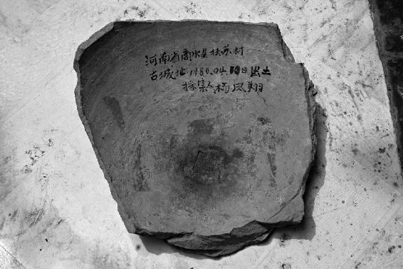 去文管所寻找当年的采集物,时过境迁,人事多变,已经荡然无存。打听到当年参与调查的杨凤翔先生还健在,当即前往拜望。杨先生七十有余,退休在家,喜迎我等远道的好古同行。一席话下来,喜出望外,杨先生就是当年陶片的采集人,采集到的四件陶片,有一件还保存在杨先生手边,欣然向我们展示。大碗大小的陶罐残底,当中一四方的戳印,陶文据考证为“扶苏(胥)司工”,陶片上有杨先生墨笔手书“河南省商水县扶苏村古城址1980,04,10日出土—采集人杨凤翔”,是仅存的一件陶片,堪称珍贵。