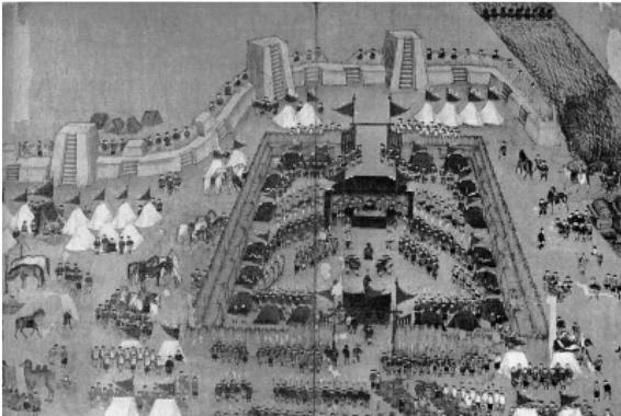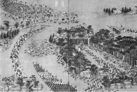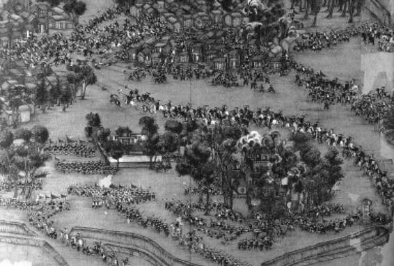 1853年夏天,太平天国定都天京,洪秀全出兵北伐,欲攻下北京,一举灭清。到了10月,约有三万太平军兵临天津外缘,离北京已不足百里。太平军在此遭遇官军,渐次南退,诸镇相继失守,最后退到大运河边的连镇。太平军在此被官军困了八个月,于1855年3月被歼灭。此处所见之图可能系天津商人为答谢官军,特请匠人绘成十幅图,上呈官军统帅僧格林沁。此处收录四幅。(原件藏于美国哈佛大学燕京图书馆)