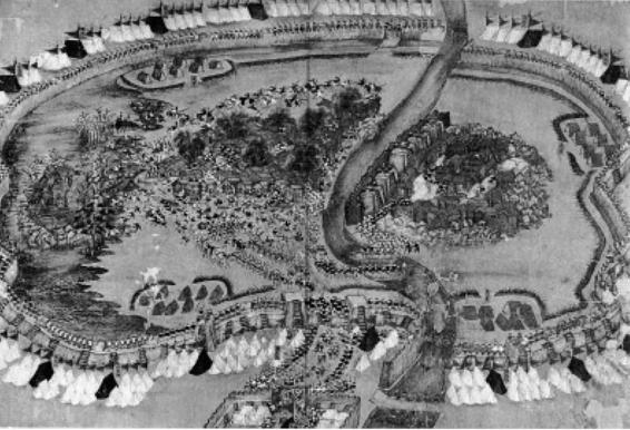 第三图为官军将太平军围在连镇,四周有土墙炮阵。