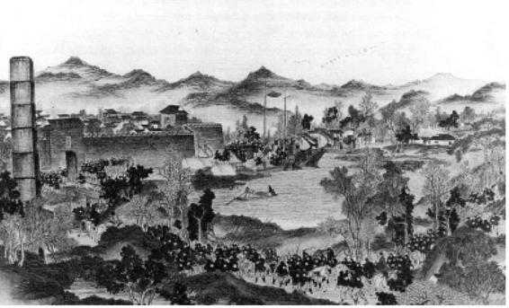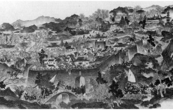由曾国藩所率的湘军击溃太平军之后不久,就有十二幅图描绘清军节节胜利的过程。此处所选的四张图分别描绘四场战役。(原件藏于台北故宫博物院)