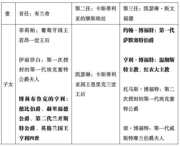 注:早夭及非婚子女未计入列表,冈特的约翰跟其母后的侍女玛莉还有个非婚女儿,也叫布兰奇。