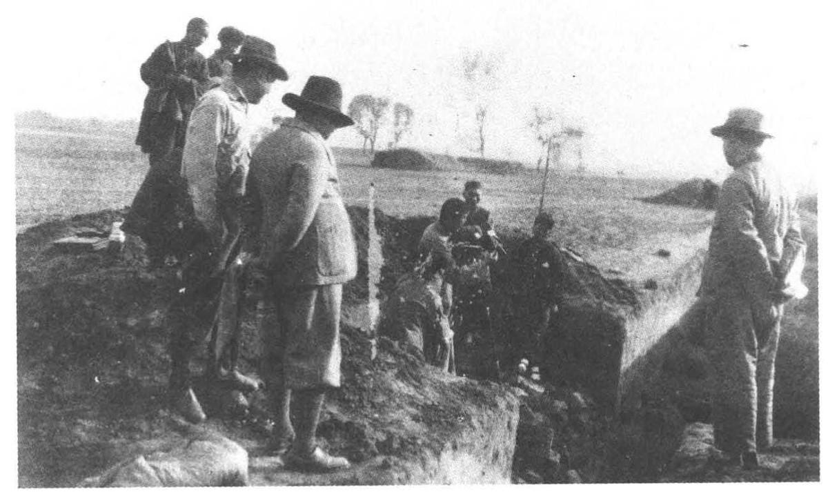 1935年,傅斯年视察第十一次殷墟发掘工地。坑右站立者为董作宾,坑左戴礼帽者为傅斯年、李济(右起)。