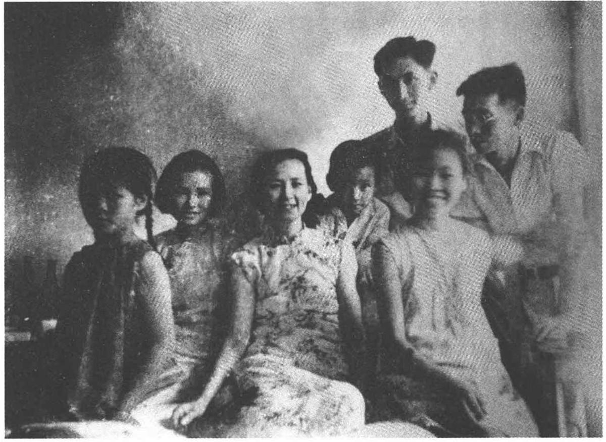 梁思成(右一)林徽因(左三)及再冰、从诫与亲友摄于李庄月亮田家中。