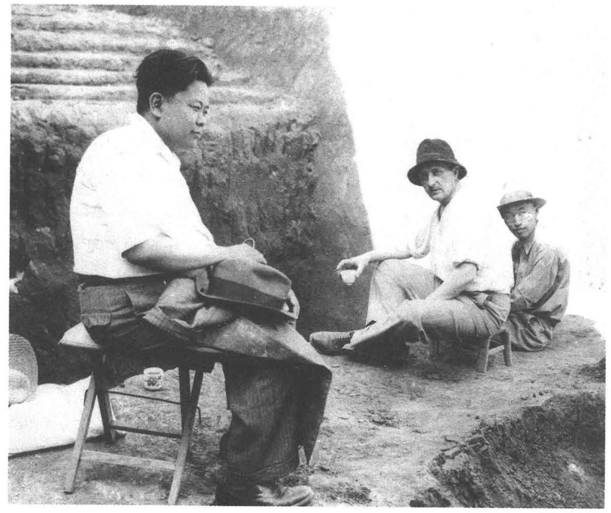 1935年,梁思永(右)在西北冈大墓接待前来参观的伯希和(法国)和傅斯年(左)。