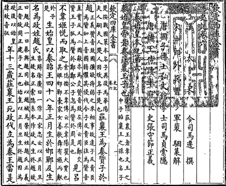 秦始皇帝者,秦庄襄王子也。庄襄王为秦质子于赵,见吕不韦姬,悦而取之,生始皇。以秦昭王四十八年正月生于邯郸。及生,名为政,姓赵氏。